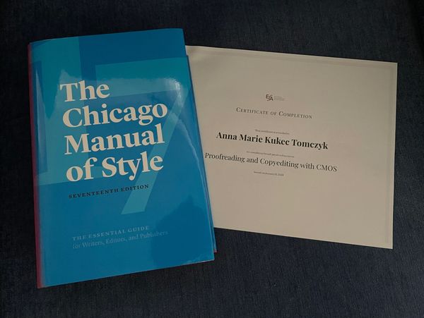 Editing: Proofreading, copyediting, line editing and critiquing of book manuscripts, essays, blogs and other content. Earned a certificate of completion from Editorial Freelancers Association in Proofreading and Copyediting with Chicago Manual of Style.